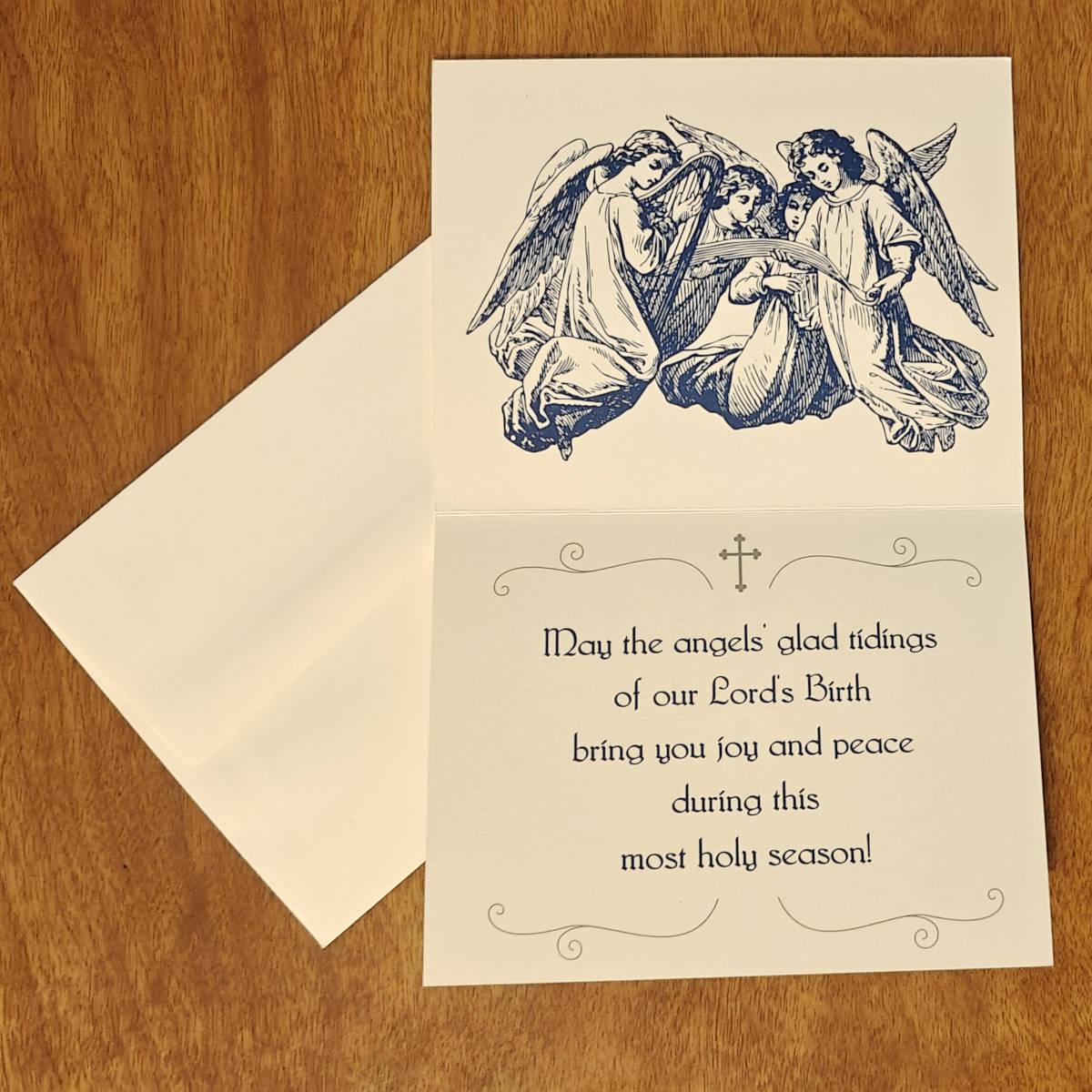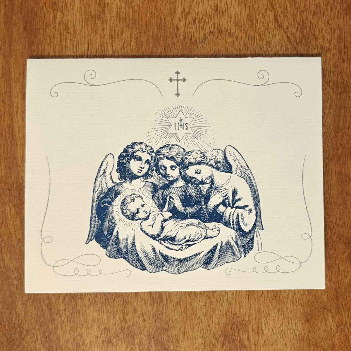 Christmas Greeting Card features a reprint of an old engraving of Angels adoring the Infant Lord on the front in blue with silver raised ink print.